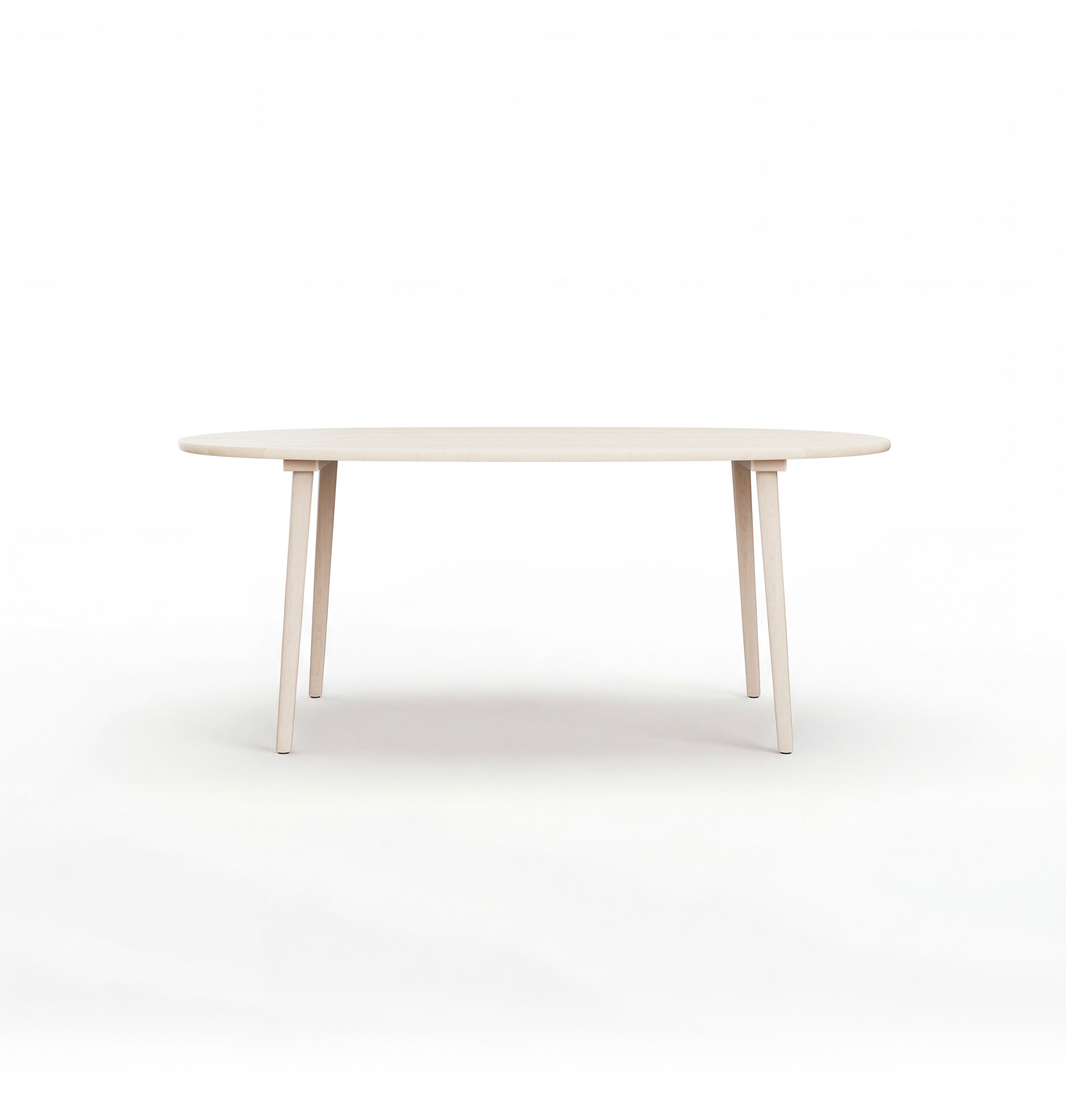 Det ovala formatet ger gott om plats för upp till 6 personer och skapar en luftig och social sittning. Bordet är sarglöst och vilar på tre stabila ben med trägängor som enkelt skruvas fast i den massiva bordsskivan.